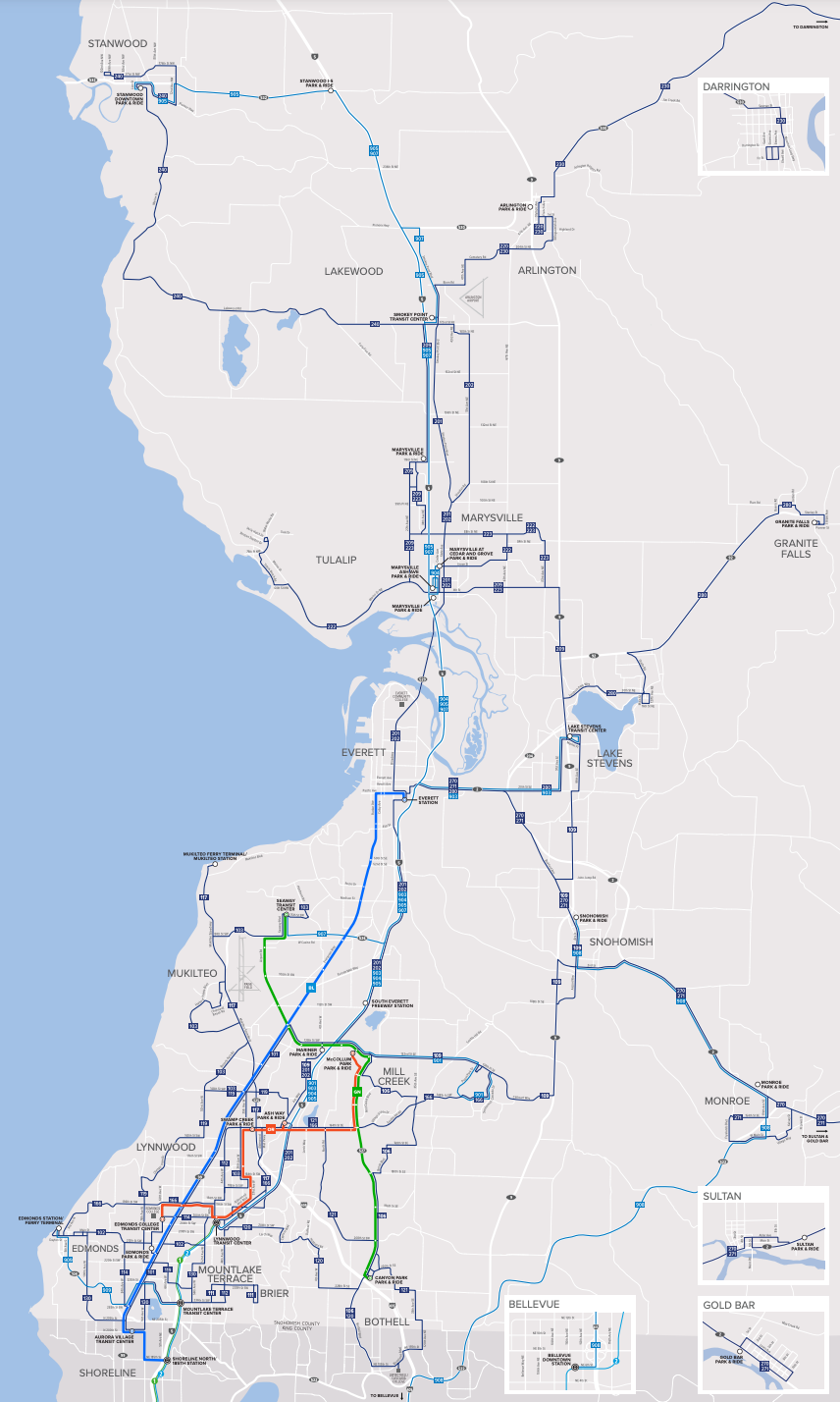 Not shown in the system plan are less frequent bus routes between places like Darrington and Arlington or Sultan and Monroe, but Community Transit is likely to provide some level of fixed-route service between these locales. “The intent of the map is to show that future investment in those areas would likely be focused on identifying more flexible and innovative service models,” Monica Spain, a spokesperson for Community Transit, told The Urbanist. “We don’t intend to take away existing service. And we would take a community’s needs into consideration when designing future service models (including connections to more metropolitan areas).”
