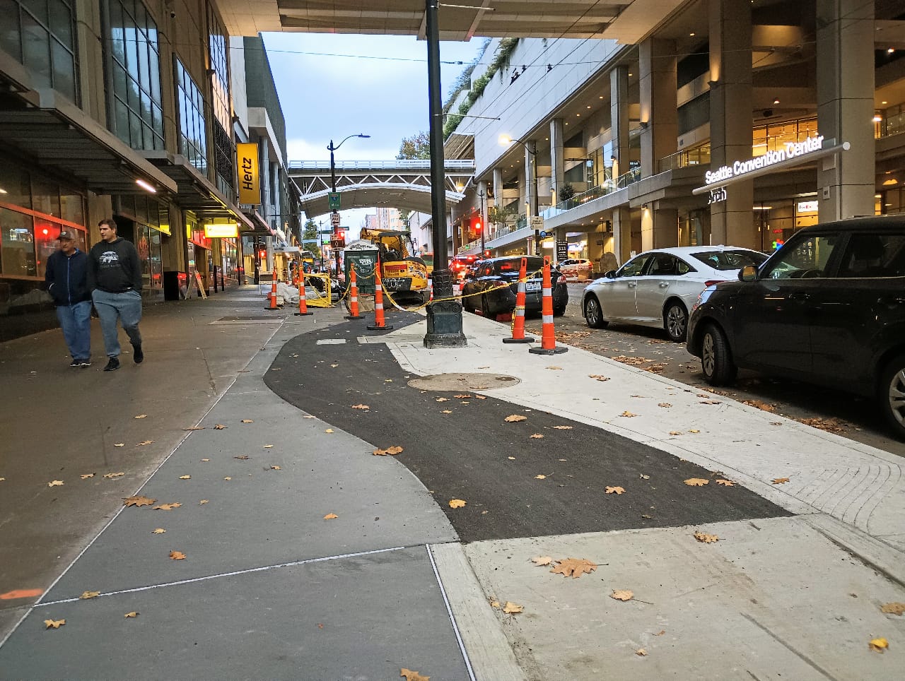 For months now, crews have been working downtown, upgrading the existing paint-and-post bike lane barriers along Pike and Pine while they make other upgrades as part of the $40 million “Pike Pine Streetscape and Bicycle Improvements,” which broke ground back in January.