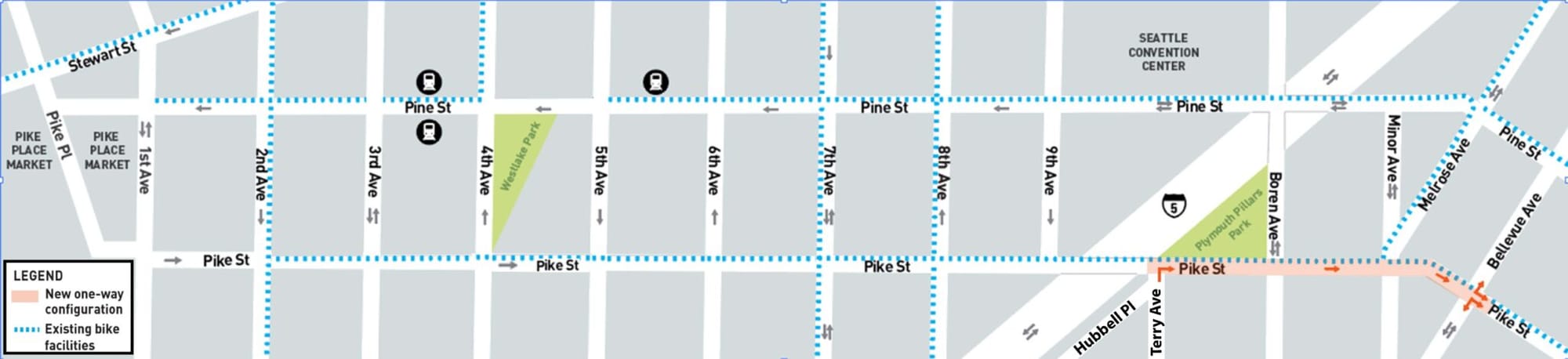 Pine Street also has a traffic revision in its future, as it gets converted to one-way operation all the way into downtown from Bellevue Avenue as well. Once those revisions are in place, Pike and Pine will operate like they do in central downtown, with eastbound traffic on Pike only and westbound traffic on Pine. An exact timeline for that change is expected in the coming weeks.