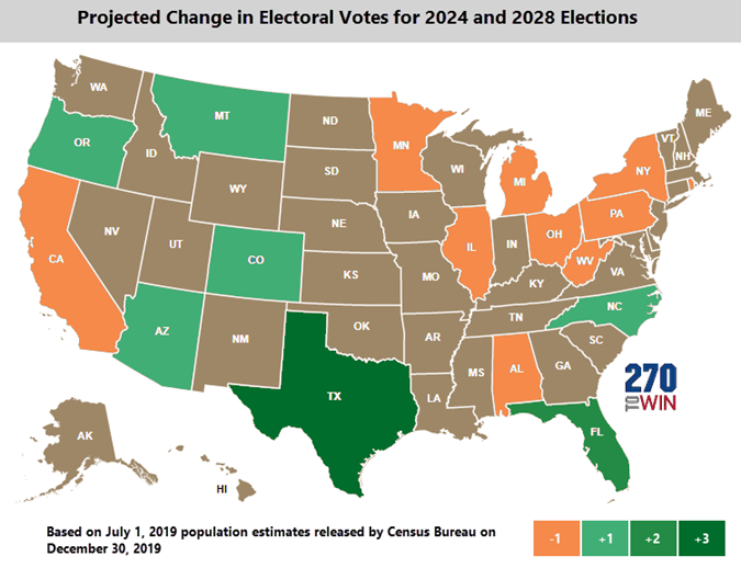 The biggest gainer will be fast-growing Texas, which is expected to get two or three additional seats, followed by Florida at one or two seats. Oregon, Montana, Colorado, Arizona, and North Carolina are projected to each gain one seat based on preliminary 2019 census figures.