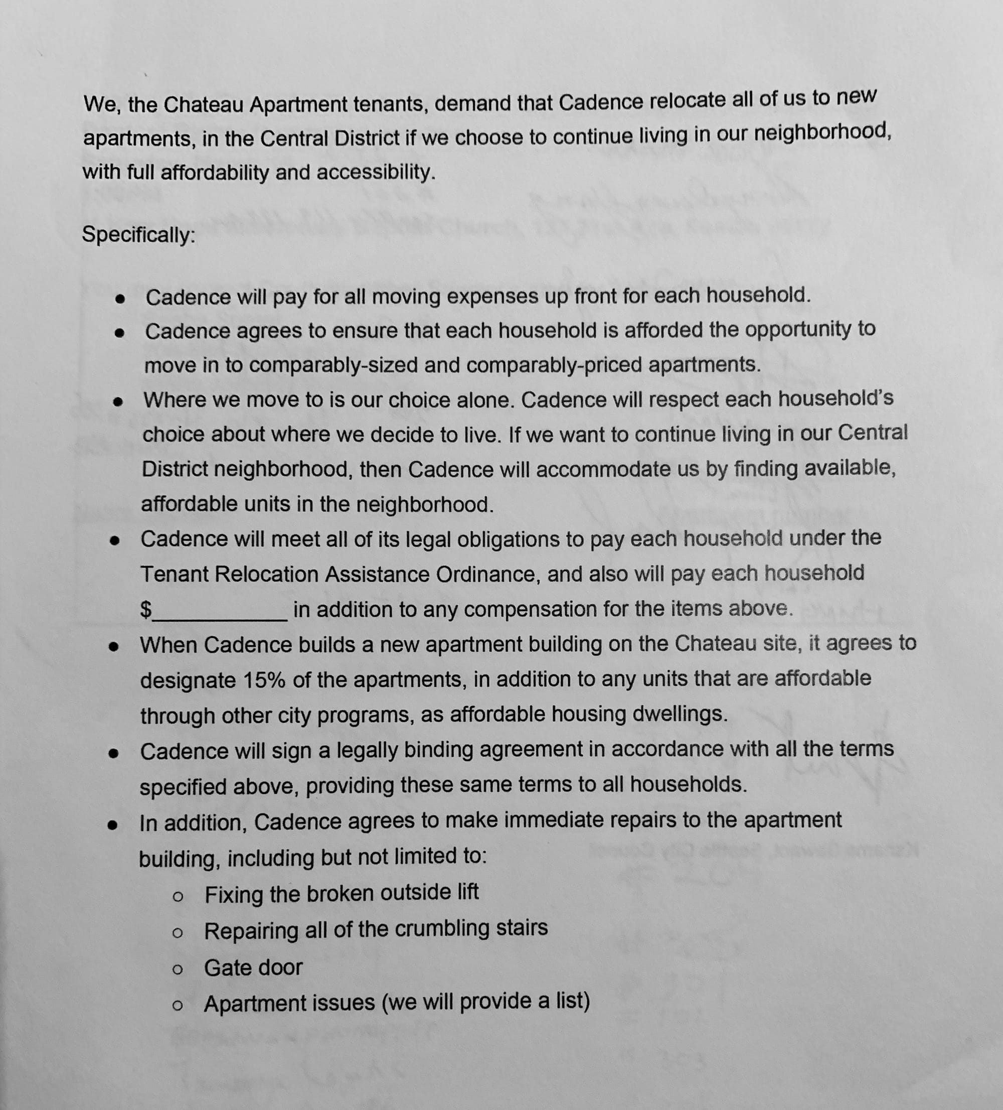 However, the tenants are seeking additional assurances from Cadence as well. In an open letter, tenants called for Cadence to assist with moving expenses for all households, ensure that each household is able to move to a comparably priced and sized apartment, and find housing within the Central District for residents who desire to stay in the neighborhood.