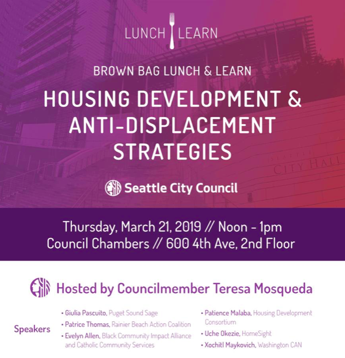 On March 21st, only one day after MHA legislation was signed into law by Mayor Jenny Durkan, Councilmember Teresa Mosqueda hosted a “lunch and learn” session in the Council Chamber devoted to the topic of displacement. Several short presentations were given local nonprofits and advocacy organizations, most of which highlighted the particular efforts being undertaken by their organizations to decrease displacement by creating new housing and job opportunities for lower-income Seattleites.