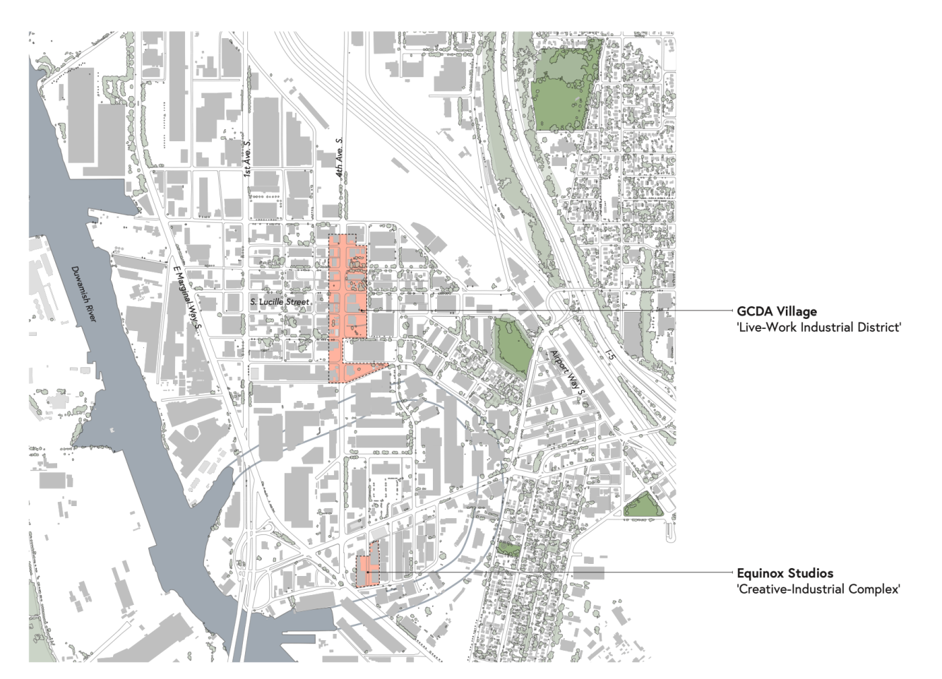 With the area on the blocks east and west of 4th Avenue S between S Dawson Street and S Fidalgo Street, the district is separated from Georgetown’s main drag by eight industrial-length blocks give or take — about a half-mile.