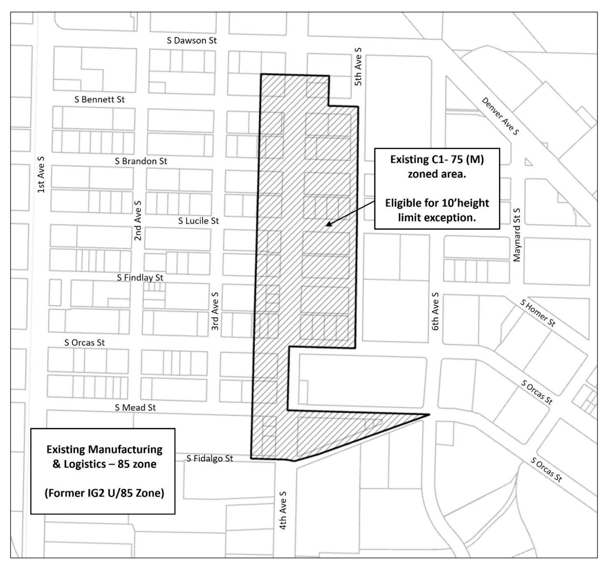 The zoning changes only apply to Commercial 1 (C1)-zoned properties. Currently regulations cap building height at 75 feet, so the zoning changes will allow buildings in the area to go to 85 feet, the same height limit that applies to some uses in the abutting industrial zones.