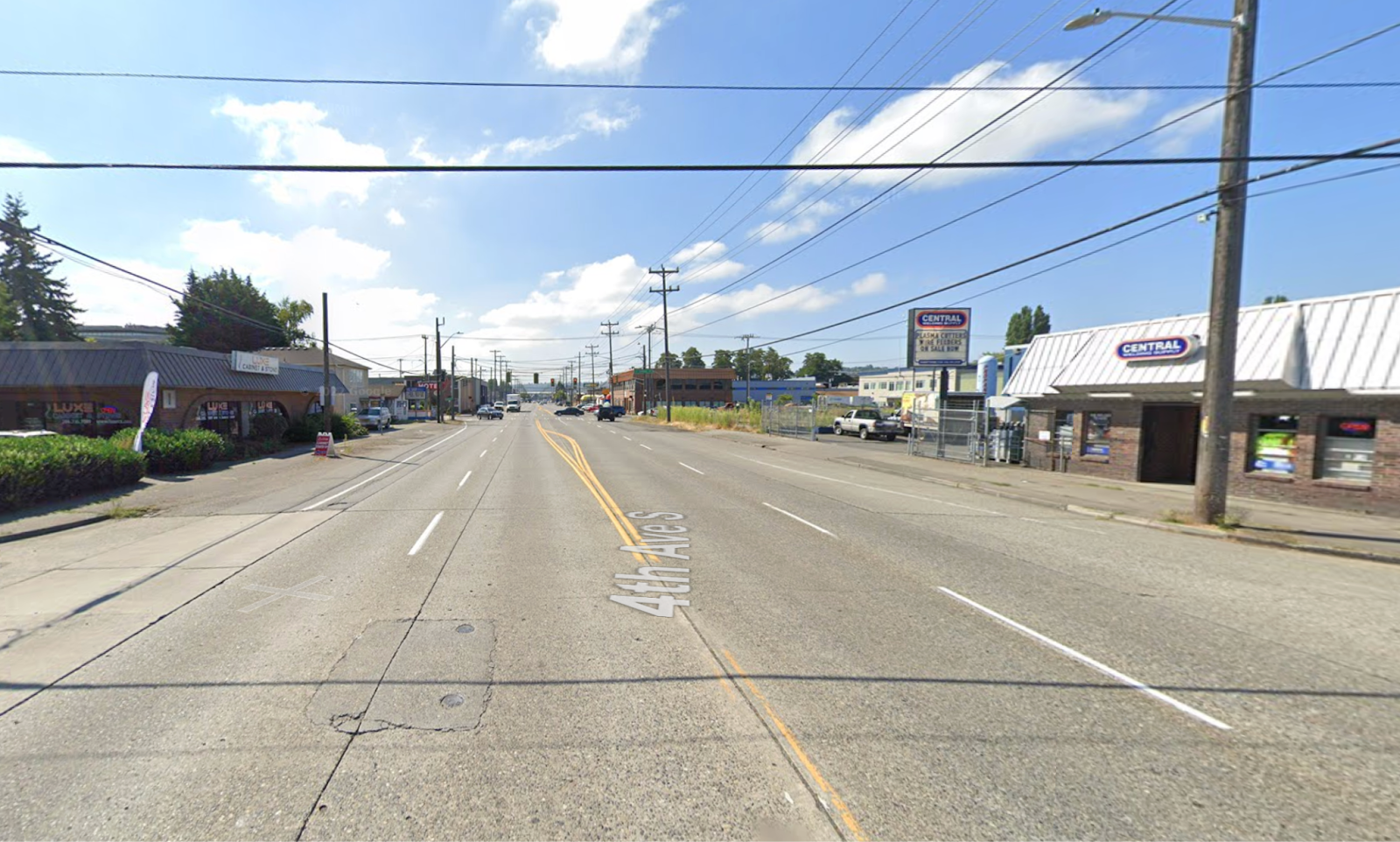 A big sticking point for redevelopment in the area is 4th Avenue S itself, which is a major trucking route with substandard sidewalks and streetscaping. Designed for speed, the street generally consists of four wide travel lanes plus turn pockets at intersections and often sidewalk-level on-street parking lanes; crosswalks are far and few between. Correcting this unsafe environment for people walking, rolling, and biking will require significant changes — potentially requiring the City to stand up to a change-adverse Freight Advisory Board and their allies at the Port of Seattle.