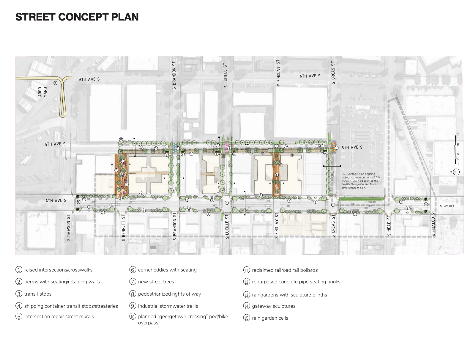 Seeming to recognize the likely freight interest opposition, Watershed Community Development has put out street concept plans that focus on street improvements east of 4th Avenue S, including some highly pedestrian-oriented east-west streets that rarely or never see freight activity. On 4th Avenue S, the concept plans essentially retain the same truck-oriented paradigm but with some targeted curb bulbs at intersections, planter strip enhancements, and removal of turn pockets.
