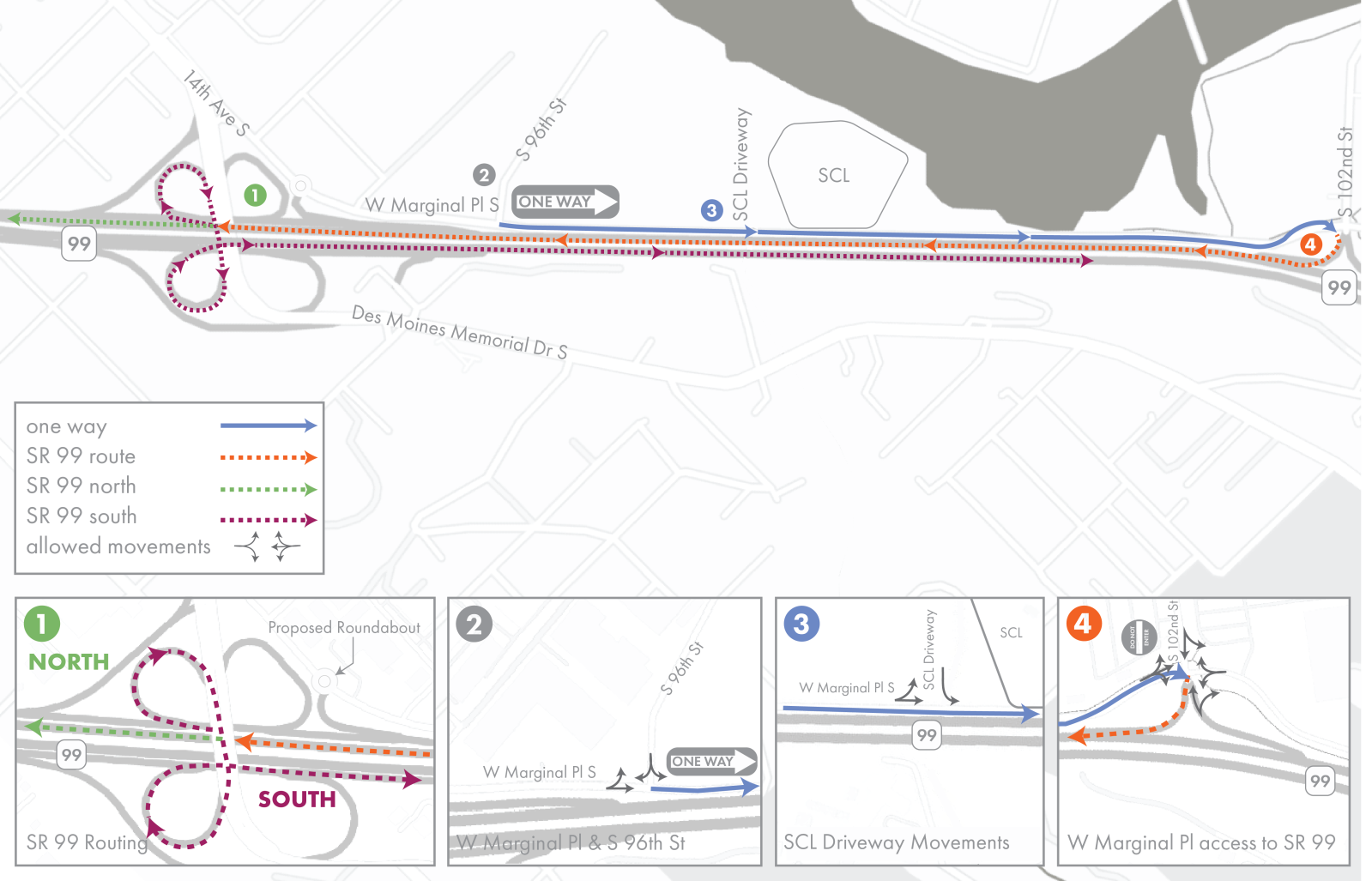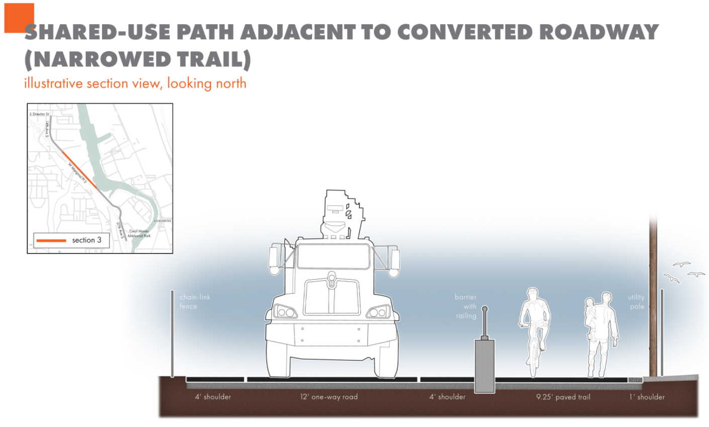 Because most of the new trail’s width is being reallocated from what’s currently W Marginal Place S, construction will prompt a permanent shift in the traffic patterns around the trail, with only a southbound lane for general purpose traffic planned to remain on the street. Drivers heading northbound will head south before using the adjacent state highway to head north again. Drivers who are ultimately heading south on SR 99 will need to head back north and use the interchange at Des Moines Memorial Drive to cross the highway and head back south.