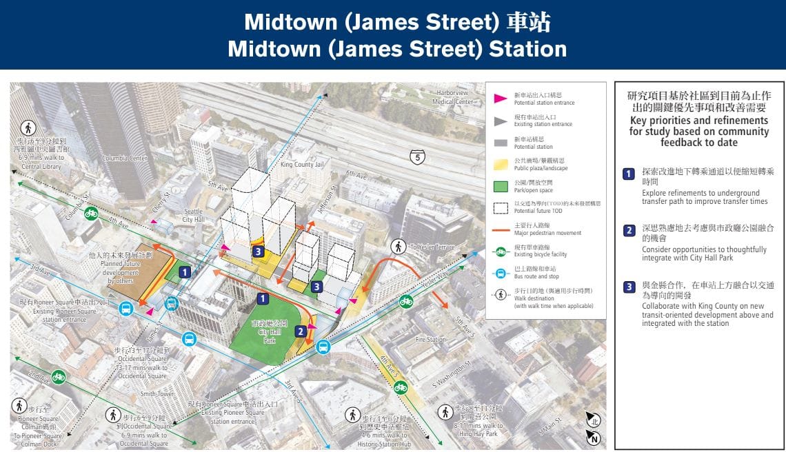 At Sound Transit’s open houses dedicated to the topic of CID light rail, posterboards and other materials have shown a large development sprouting from the agency’s new Pioneer Square station, taking the place of today’s County Administration Building, which is presently shuttered as office needs have shrank in the pandemic era. While not pictured as a highrise rivaling Columbia Center or the 100-story megaproject that Constantine floated last spring as he announced support for switching station locations, it does appear to be a substantial redevelopment of perhaps 20 stories in Sound Transit’s visioning, which granted are for illustrative purposes only.