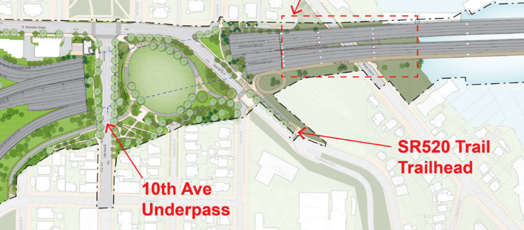 The tunnel underneath busy 10th Avenue E has been included in plans codified in 2019 and dating back even earlier, to a comprehensive study of bike and pedestrian connectivity in the area from 2014. Its inclusion would better integrate the highway lid with the North Capitol Hill street grid and a recently improved “Melrose Promenade” route to Summit Slope — or to South Lake Union via Lakeview Boulevard. The tunnel would offer those coming from the Harvard Avenue corridor safe and convenient access to an extended SR 520 Trail.