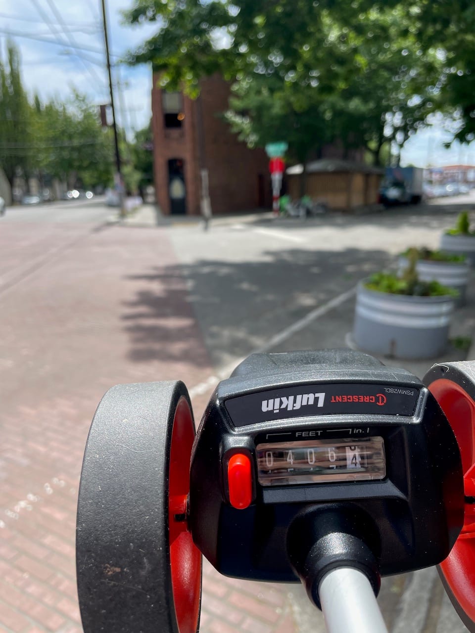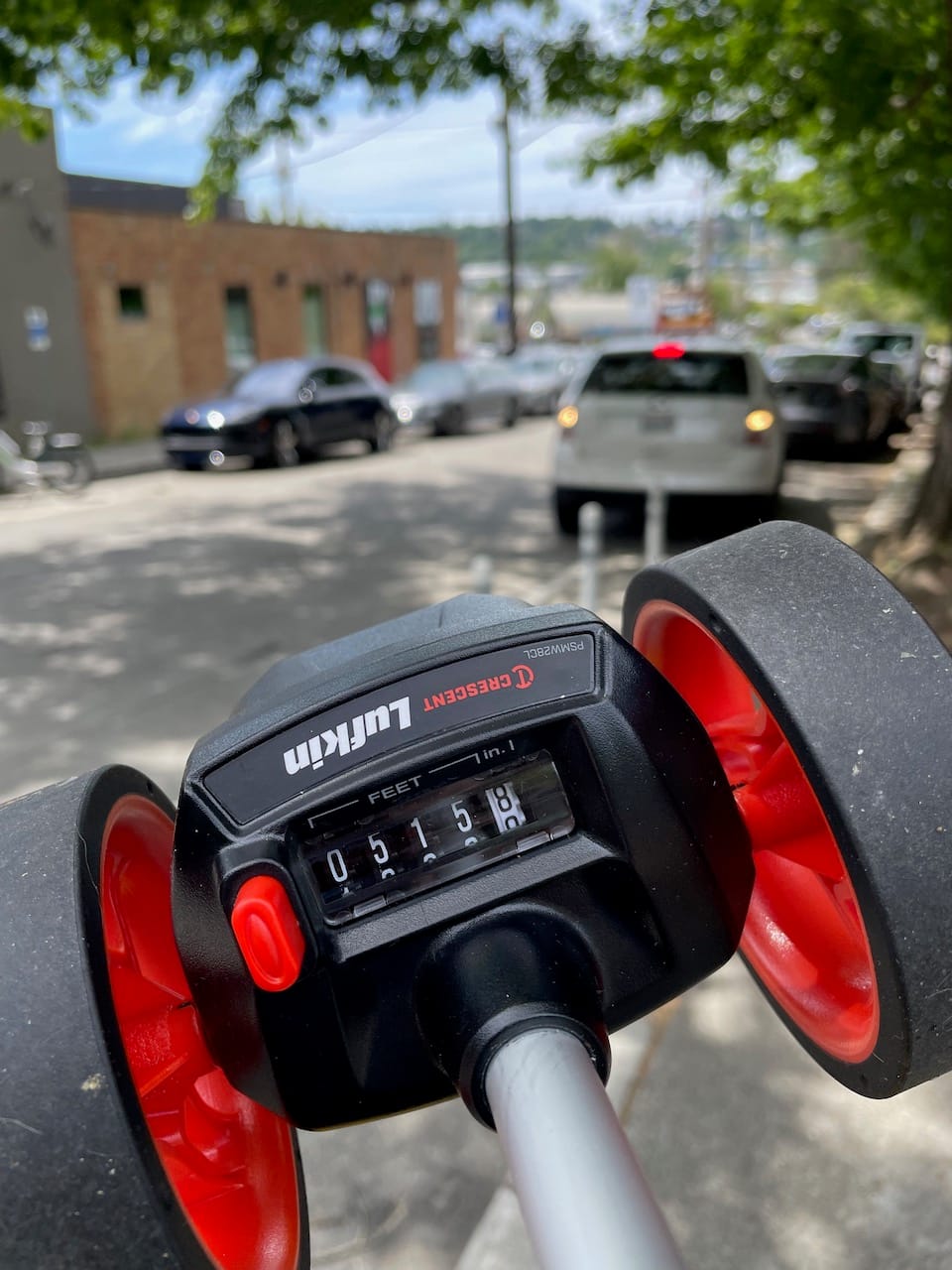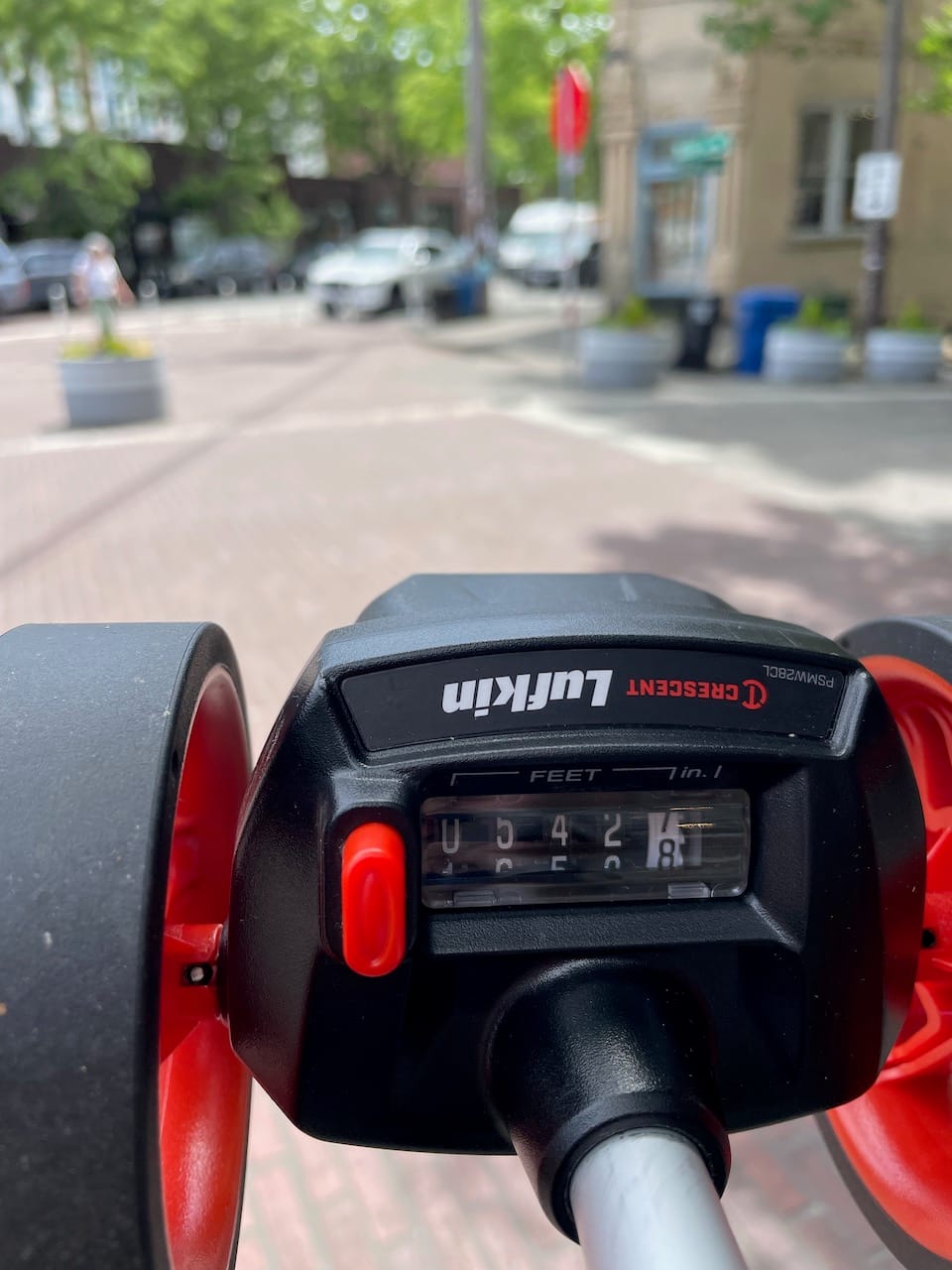 I ran the rolling tape measure (his name is Umlaut) out to a couple stores to figure out how much distance it functionally takes to get out and back from the parking lot to something basic, like the milk fridge. It’s a lot.