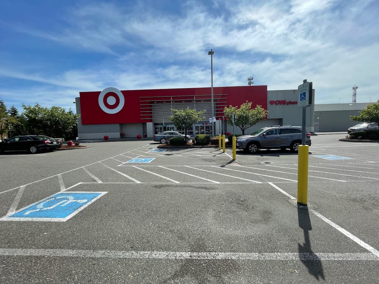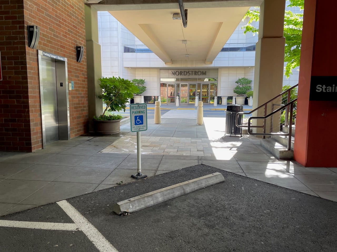 Now, it’s easy to argue that people have grocery carts, and that’s accurate (though cart use is often overestimated). How about shopping where carts are not used, like Alderwood Mall. We forget that the mall is huge. Walking from the closest accessible parking space and strictly around the food court totals up to 701 feet. To walk the shortest distance from that accessible space to the closest accessible parking in another location (Nordstrom’s) is 1167 feet.