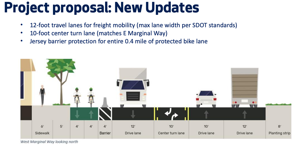 SDOT also presented a cross-section of the planned configuration for all lanes within the segment where the bike lane would go. The Freight Advisory Board has been concerned about lane widths, even presenting their own possible configuration that showed freight trucks in 10.5-foot lanes in both directions along Marginal. One 12-foot lane would be maintained in one direction, with the center turn lane and the remaining northbound lane becoming ten feet wide. With four feet for the buffer with the Jersey barrier in it, that leaves four feet for each direction in the bike lane, a tight squeeze but likely the best that could be accommodated given the constraints here.