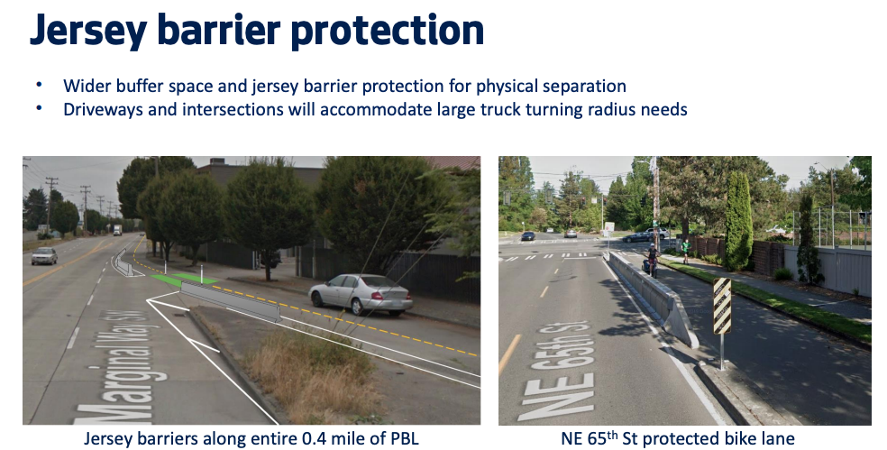 New details on the protected bike lane are revealed by the SDOT slides that The Urbanist has been able to obtain after the meeting. The biggest detail is that the current plan for West Marginal is to install a Jersey barrier along the entire length of the lane. Jersey barriers are not often used in bike lane projects in Seattle, but adding a bike facility to a freight corridor like Marginal calls for substantial protection.