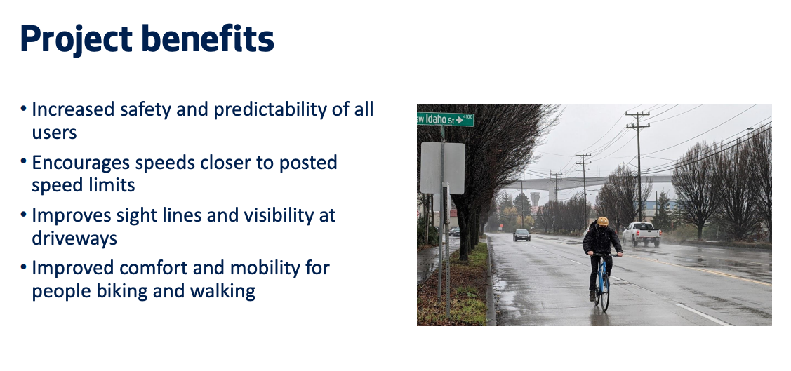 Former Mayor Greg Nickels, chair of the West Seattle Bridge Community Taskforce, has cited driveways used by businesses along the corridor as one reason the project needed further study. SDOT’s presentation notes that they are designing the lane to accommodate movements made by large trucks, and that it’s much easier to exit a driveway onto one lane of moving traffic rather than two. But freight advocates, including Port Commissioner Peter Steinbrueck, have continued to push the City to explore options that would place the trail extension on the sidewalk, which would be exponentially more expensive and involve the removal of street trees. It’s also not clear how that would be better for visibility.