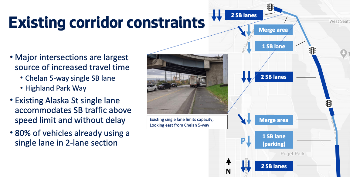 The Freight Advisory Board has also cited the improvements being made at Terminal 5 and the planned expansion of SR-509 (which connects with SR-99 at West Marginal Way) in South King County as reasons that capacity on West Marginal Way SW should not be reduced. But an SDOT presentation to that board earlier this year noted that the Terminal 5 improvements are only expected to add three additional southbound trucks to the facility compared to current traffic levels, a change of 0.3%. On Friday, the department again noted that the stretch of Marginal Way in question is not a bottleneck here; the five-way intersection at Chelan Ave SW is — and 80% of the vehicles going southbound are using the other southbound lane already. Using a highway expansion sucking up state highway funds as an excuse to not construct a segment of the dramatically underfunded Seattle Bicycle Master Plan is a nice touch, though.