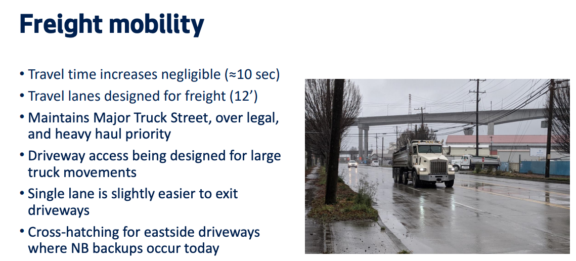 SDOT reiterated that it expects the impacts from adding this bike lane to amount to around ten seconds of delay. The argument hasn’t seemed to placate members of the Freight Advisory Board, who appear to view this project as more important symbolically as SDOT taking space in their domain: a major truck street.
