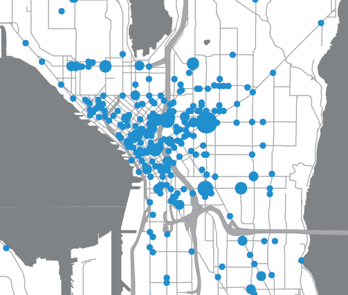 Seattle’s annual traffic report includes a map of the locations where pedestrian collisions occurred, with the number increasing with the size of the blue dot.