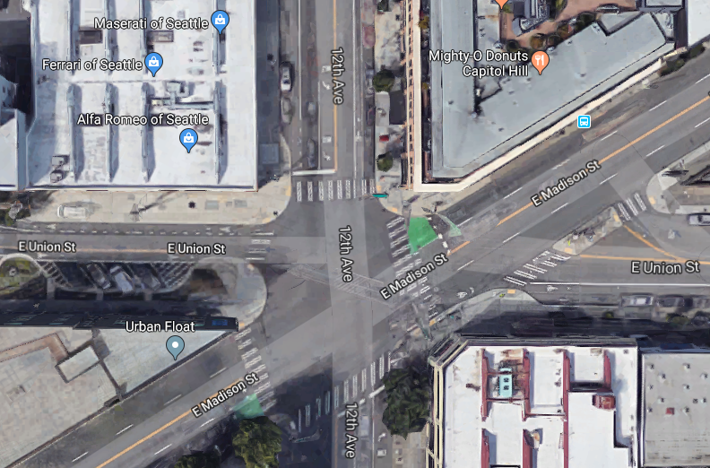 Last year was not an anomaly: David Gutman at the Seattle Times identified 12th and Madison as the 5th most dangerous intersection in the city between 2008 and 2017, with 14 injuries to pedestrians recorded by the Seattle Police Department during that period.