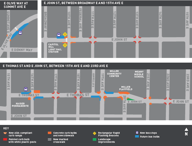 Elsewhere along the 8 route, SDOT is also installing bus bulbs at several stops in Capitol Hill, in coordination with an Neighborhood Street Fund grant that will be improving intersections along the entire John Street and Thomas Street corridor between Broadway and 23rd Ave.