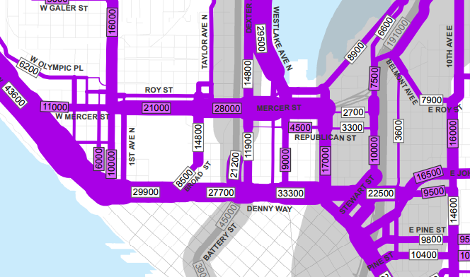 It is assumed that travel lanes on Denny Way will continue in their current format. No dramatic roadway reconfigurations were studied or proposed. This is consistent with Seattle’s ongoing Urban Mobility Plan, a system-wide transportation study related to viaduct and seawall replacement. No reconfiguration of Denny Way was proposed in the Urban Mobility Alternatives, or the preferred Viaduct replacement outlined by elected officials in January, 2009. It is assumed that Denny Way will continue as a Regional Connector street with high traffic volumes in the 30,000 ADT range.