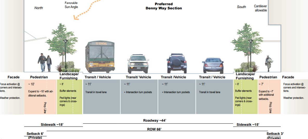 Plans like these can create a bureaucratic morass. A new plan refers to an old plan that eliminated a big idea in order to continue dismissing the big idea. Thus, we can’t have big ideas! Someone has to step out a limb. The publicly owned right-of-way on Denny Way is 66 feet wide, which is still plenty to dream big. And, in fact, just a few years after SDOT wrote no big reconfigurations were studied or planned, it was implementing an eastbound dedicated bus lane.