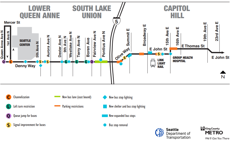 The new bus lane will be painted this week, piggybacking on Denny Substation construction. SDOT will implement the full package of Route 8 upgrades by early 2018. Expanded bus stops on Olive Way and E John St should help buses having to leave and re-enter busy traffic on their way up the hill and provide more space and amenities for waiting passengers, Metro claims. The agency also promises new shelters, benches, and better lighting at several Route 8 stops.