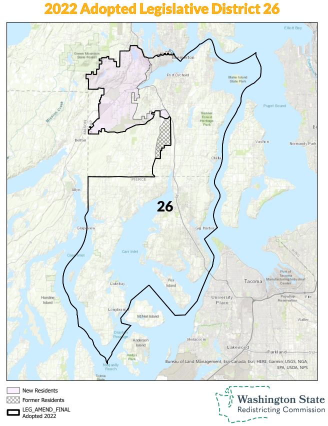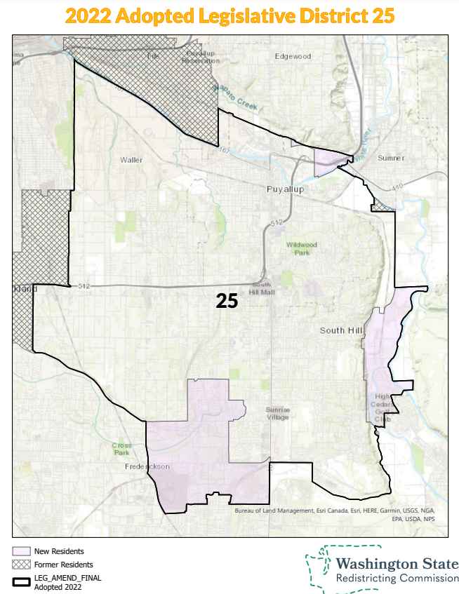 The 25th District had been safe ground for Republicans, but it continues to slowly drift away from them. Republicans hold a three-point edge in the new map, which continues to be anchored by Puyallup and South Hill, but dropped Fife and a piece of Parkland. No Democrats have registered with the PDC yet in this district.