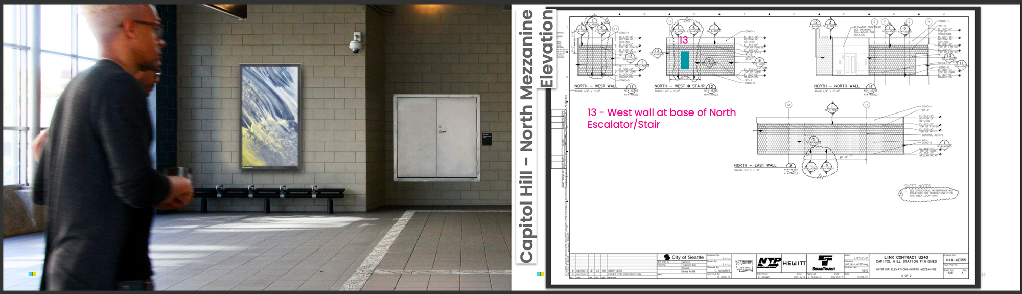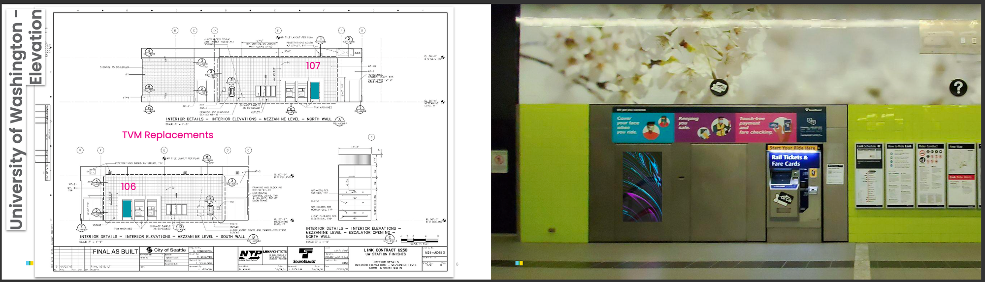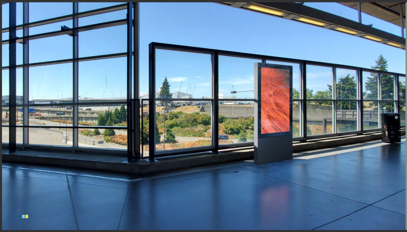 The latest plans show Sound Transit will mostly receive wall-mounted digital screens, though some could be be floor-mounted like one slated for SeaTac/Airport Station near the airport exit. These models appear to be 75″ screens that are set in the portrait fashion. Many could end up at platform levels while others could be located on mezzanines and main entrance areas. Drawings suggest that the digital screens shouldn’t heavily impact station artwork, but they could wind up in locations ready-made for future ticket vending machines (though usually leaving an extra slot for another ticket vending machine).