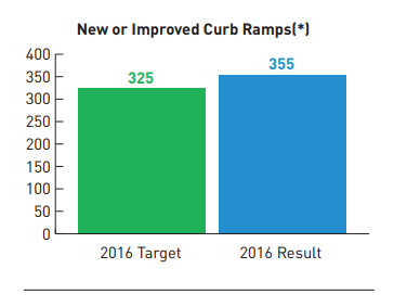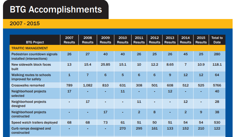 Just to give an idea of how much we need to ramp up construction (no pun intended), the 625 new ramps that we need to construct before the calendar turns to 2018 is approximately the same number of ramps that were built under the last four years of the city’s previous transportation levy, Bridging the Gap. (There appears to be a typo in the above graphic from the 2015 Bridging the Gap annual report–the total number of curb ramps constructed was 1,221 and not 122.)
