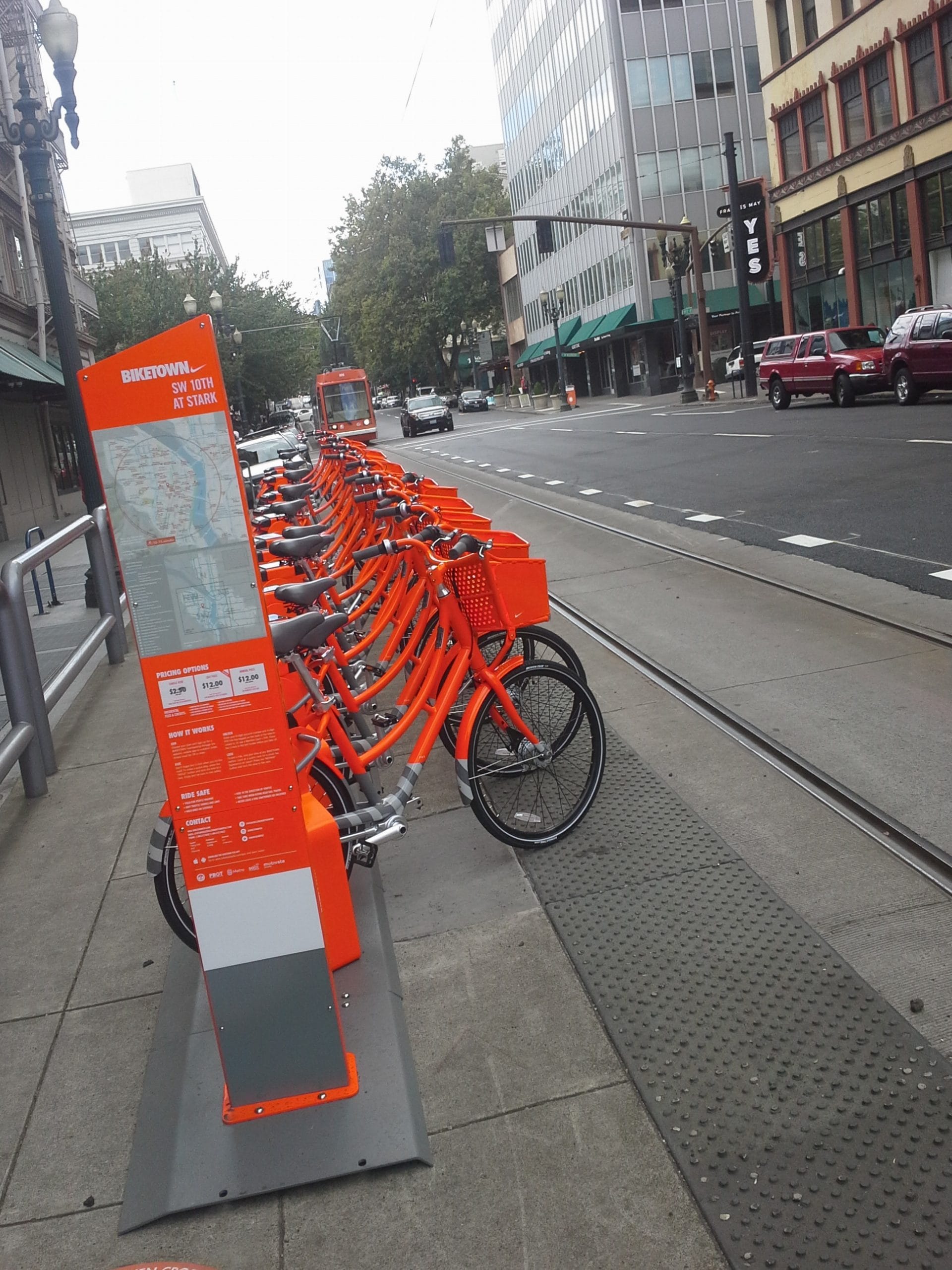Station placement wasn’t perfect. Stations were not as ubiquitous in downtown Portland as I expected, and they appeared to have been plopped down a bit haphazardly there, much like in Seattle. One station is currently taking up an entire decommissioned Portland Streetcar stop, with very little clearance between the bikes and the platform edge. (Hey, pretty soon that will be a Seattle Streetcar running on those tracks!) I expect that the Portland Bureau of Transportation will look at how stations are performing in the coming months and make adjustments accordingly—something I wish was happening in Seattle sooner rather than later. Like Seattle, Portland does plan to expand their service area in the future.