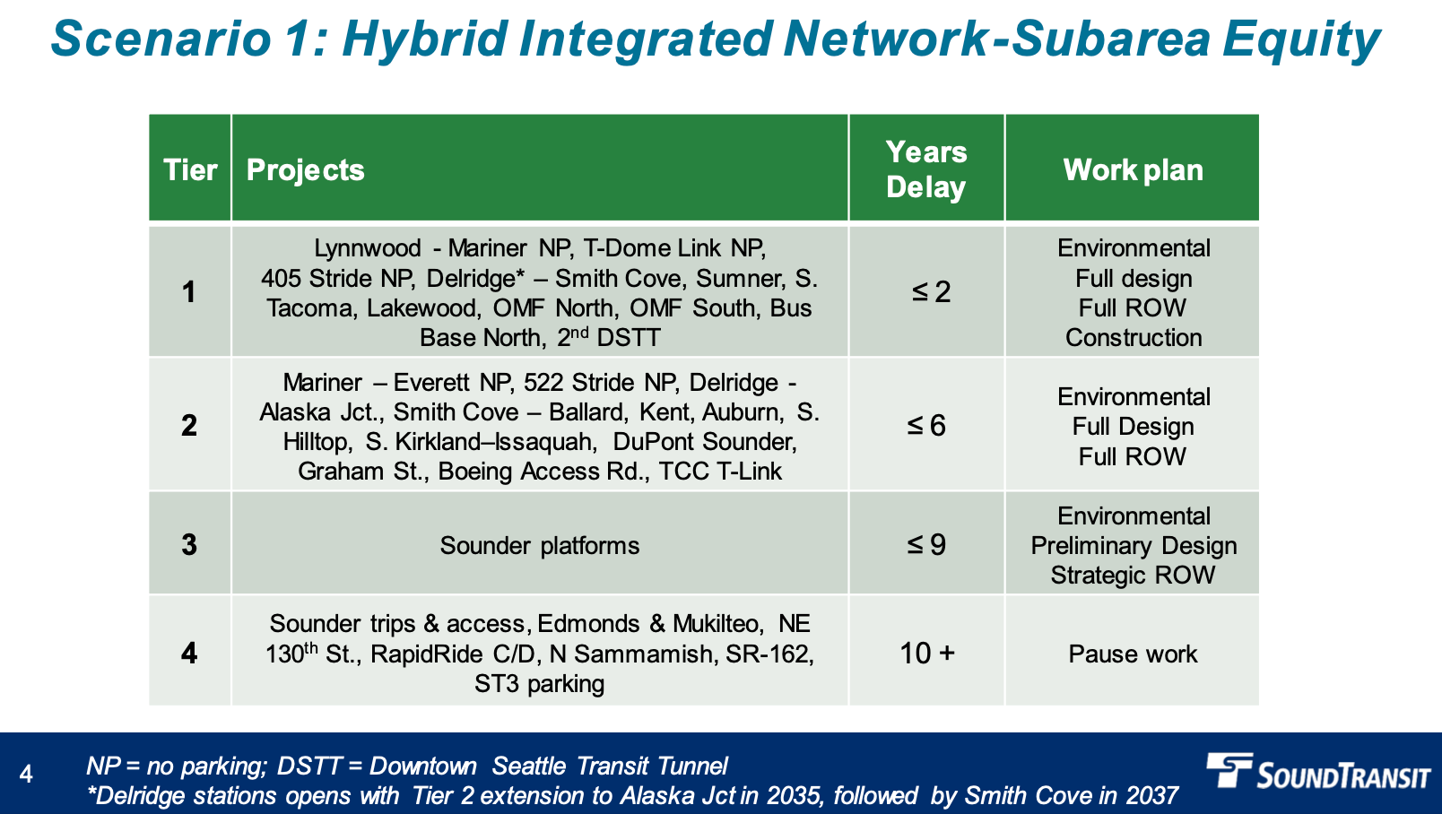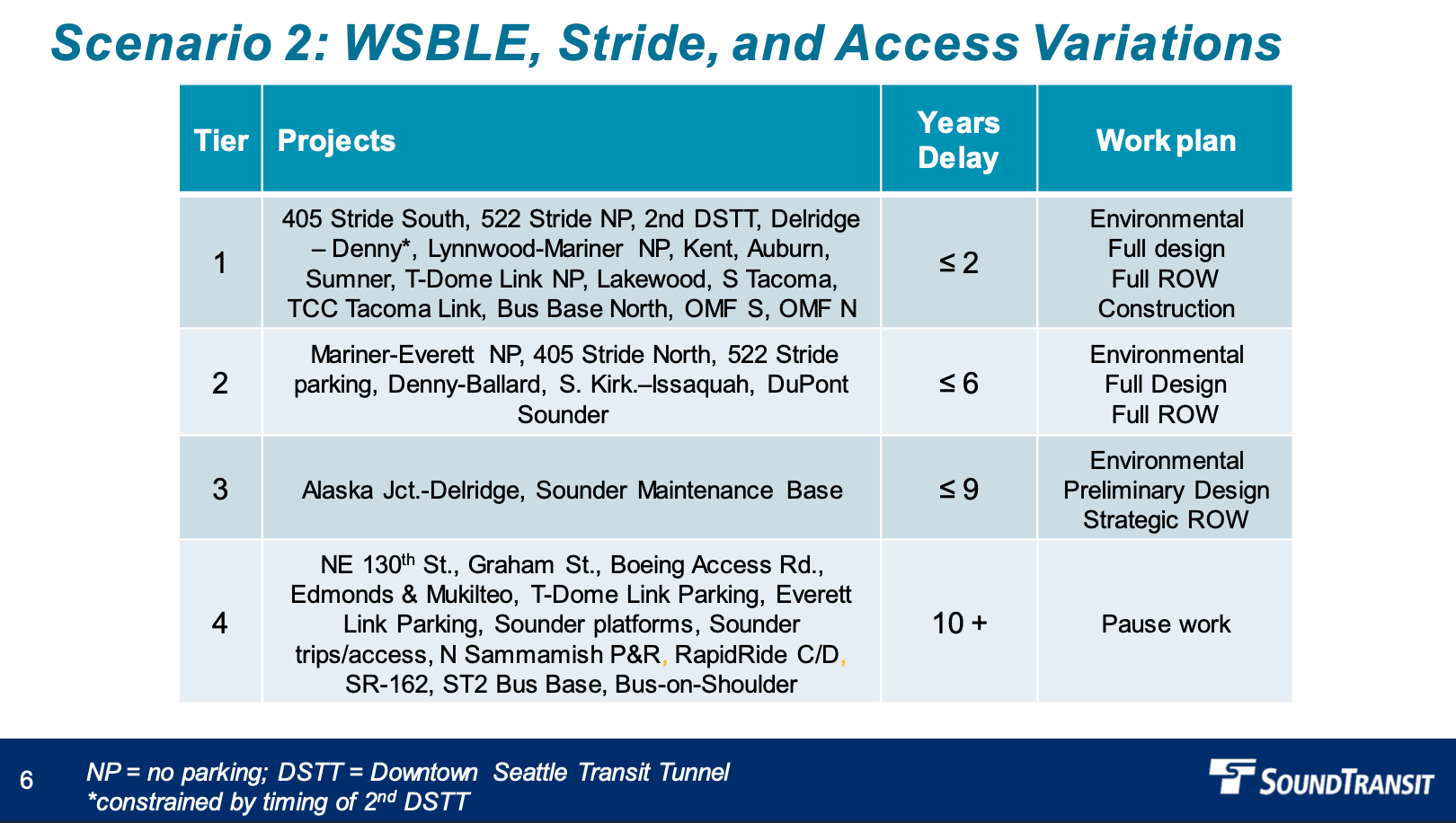 The second scenario presented centered the progression of West Seattle and Ballard Link extensions with access project variations. The first two tiers have the same level of years of delay as the first scenario. Key light rail projects in the first tier include Tacoma Dome Link (2032), Delridge-Denny Link (2035), the second Downtown Seattle Transit Tunnel (2035), Lynnwood-Mariner Link (2038), and Tacoma Community College-Tacoma Link (2041). That tier would also see the completion of I-405 and SR-522 Stride bus rapid transit in 2026. For the second tier, additional light rail extension projects would advance with Denny-Ballard Link (2041), Mariner-Everett Link (2041), and South Kirkland-Issaquah Link (2045). The light rail projects would wrap up in the third and fourth tiers with Alaska Junction-Delridge Link in 2038 and Seattle infill stations (Graham Street and NE 130th St in 2041 and Boeing Access Road in 2041).