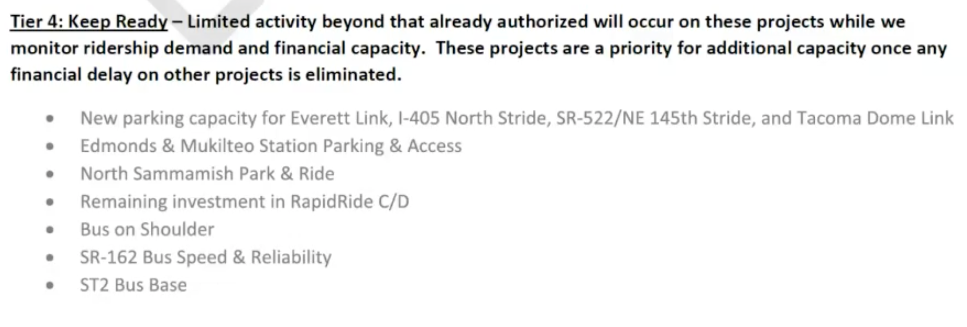 For the tiers, the draft resolution has yet to solidify projects that will be chosen. An example shared with the board, however, did use Scenario 3 projects to show how things could stack up. Tier 1 projects would be classified as “develop” allowing for completion of environmental review, design, and right-of-way acquisition. Authorization of baselining and construction would still need to be approved by the board before those actions could occur. Tier 2 projects would be classified as “prepare and plan” and also for environmental review so that they can be shovel-ready, but other actions like design and right-of-way acquisition would be more gated. As for Tier 3 projects, these would be classified as “plan” allowing only for environmental review; other actions would remain on hold. Then for Tier 4 projects, they’d be on hold for the time being and placed in a “keep ready” classification.King County boardmembers offer stark critiques
