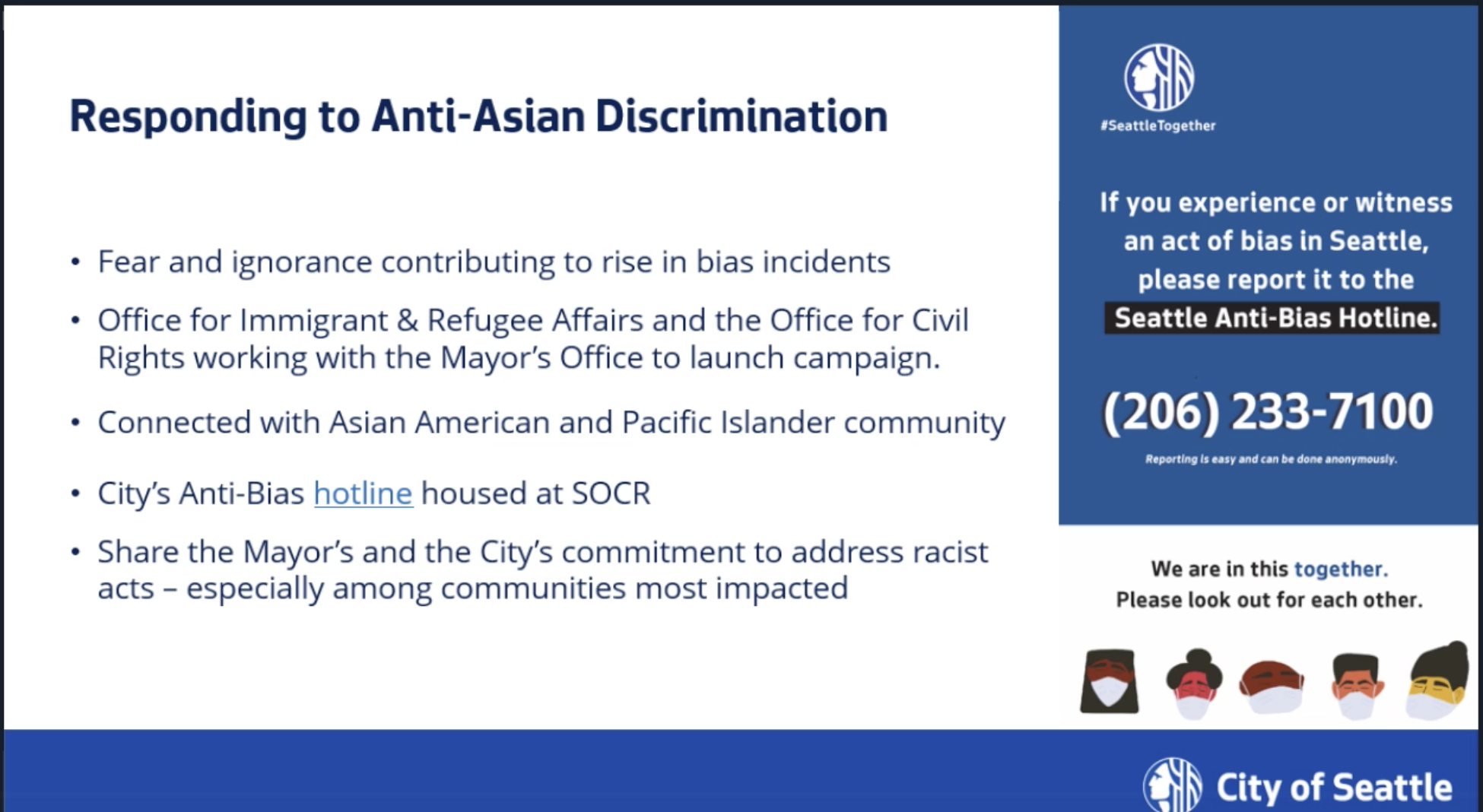 The answers were similarly straightforward. The Office of Labor Standards has an extensive explanation for employers to learn how they shall provide employees with paid sick leave. The city’s Covid-19 Resources Page will be a clearinghouse of online resources. The City will not tolerate violence towards members of Asian American communities, and the Office for Civil Rights asks the public to report bias incidents, including slurs, intimidation, or racist graffiti. The office will track reports to develop ways of addressing the issue. The police will still respond to violent incidents.