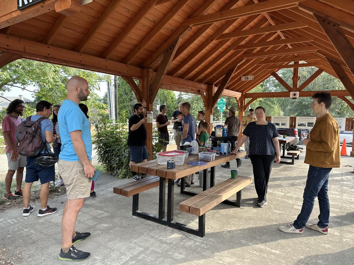 You don’t have to arrive on a bike (though we will admire you if you do), and you don’t have to hand-make your coffee (though we will also admire that!) We decided before spinning up this instance of Coffee Outside that it would be great to be able to provide coffee so that people simply riding or walking by could make an unplanned stop. We set up in the same spot every week, at the nexus of two major active transportation routes: the Cross Kirkland Corridor (CKC) and one of Kirkland’s neighborhood greenways.