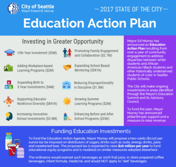The other new funding source announced would be dedicated toward education: a two cents-per-ounce tax on sugar-added beverages. The approximately $16 million that would come from this new tax would go toward a slate of education-enhancing programs. The most high profile one would pay for the first year at a Seattle (community) college for Seattle residents directly following their senior year in high school- the “13th Year” program.