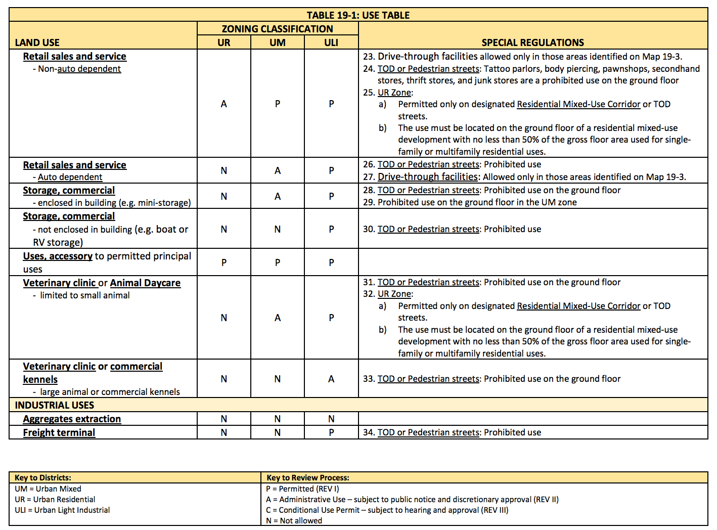 - Allowed uses. The newly established zones come paired with detailed use matrices to identify whether or not specific uses are allowed and any special conditions that apply to them.