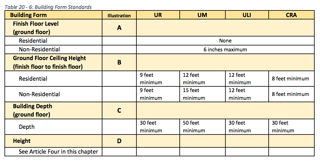 - Minimum building heights. Some zones and street types will require primary buildings to achieve a minimum number of stories. TOD Streets will set the minimum at four stories while the ULI zone will require none (de facto one story).