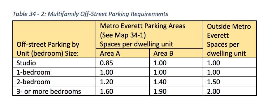 - Parking reductions. Minimum off-street parking requirements apply throughout Metro Everett by use. However, Parking Areas have a variety of possible exceptions, particularly for non-residential uses. The city also offers several parking reductions for multifamily uses by location and unit size or by resident, transportation, or development characteristics. For instance, low-income and affordable housing units or multifamily sites served by frequent transit can obtain off-street parking reductions. Alternative reduction options are provided for carsharing, additional bicycle parking, motorcycle parking, mixed-use projects, and submission of a parking study.