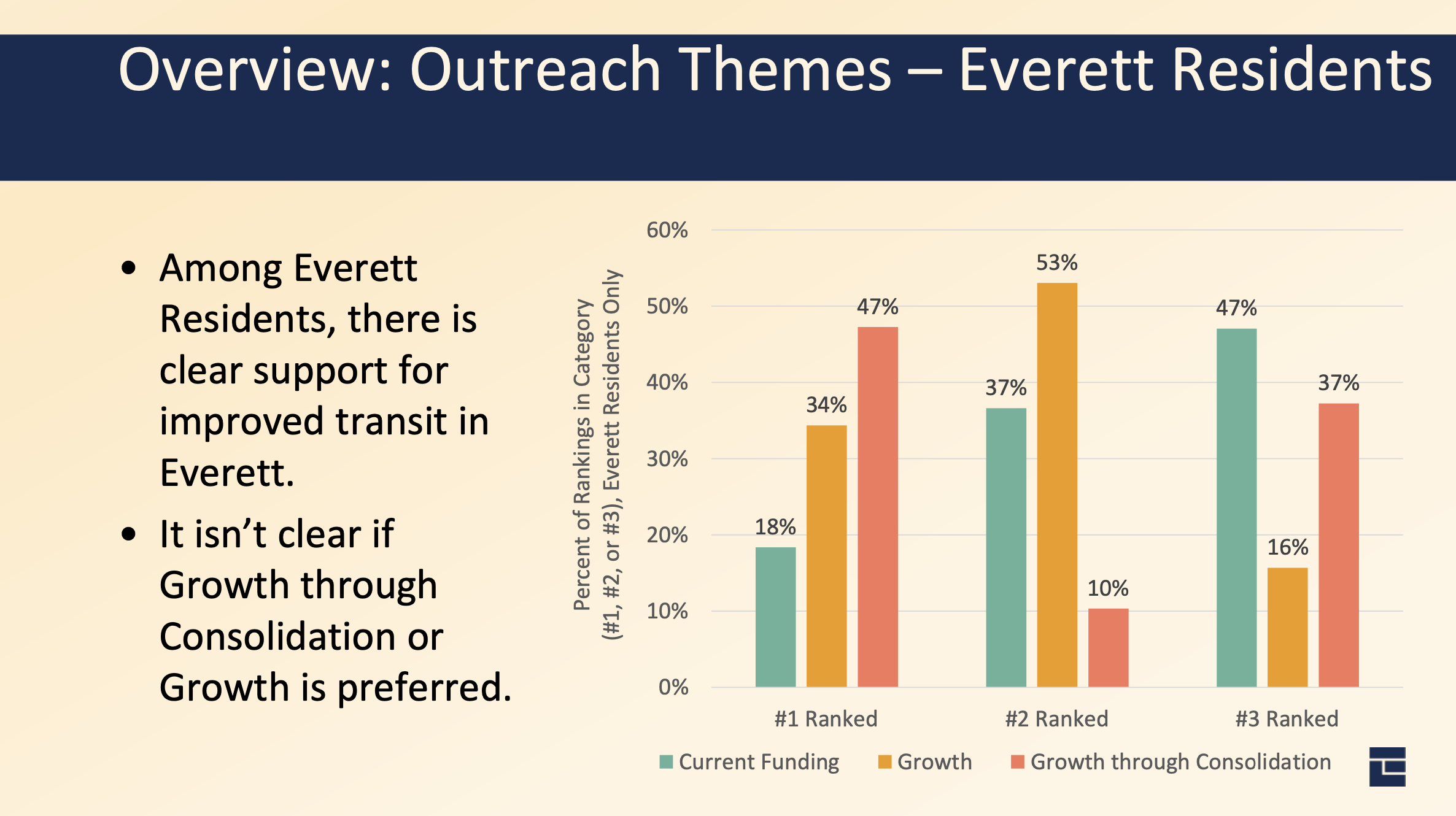 Everett ran a survey on the different options. There was a strong consensus that the status quo Current Funding approach is not desirable. Instead, people were generally supportive of Growth through Consolidation as a first choice, though many Everett residents also supported the Sustainable Growth option.