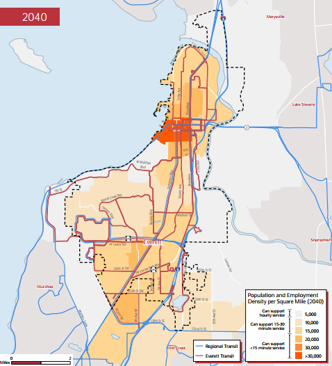Everett has started work on a major long-range planning process for the city-owned transit system. Population and employment are projected to grow substantially in the coming decades, which begs investments in transit. By 2035, the number of residents in Everett is projected to grow by 60% to more than 165,000 (up from 104,900 residents in 2014). The City plans to focus much of that growth in Everett’s burgeoning city center. More than a quarter of the 60,000 new residents will live in Metro Everett, the city center area. At least 25,000 new homes will be built, and jobs growth is also expected to leap by more than 46,000. The first phase of the long-range planning process for Everett Transit is centered on high-level community vision and values.