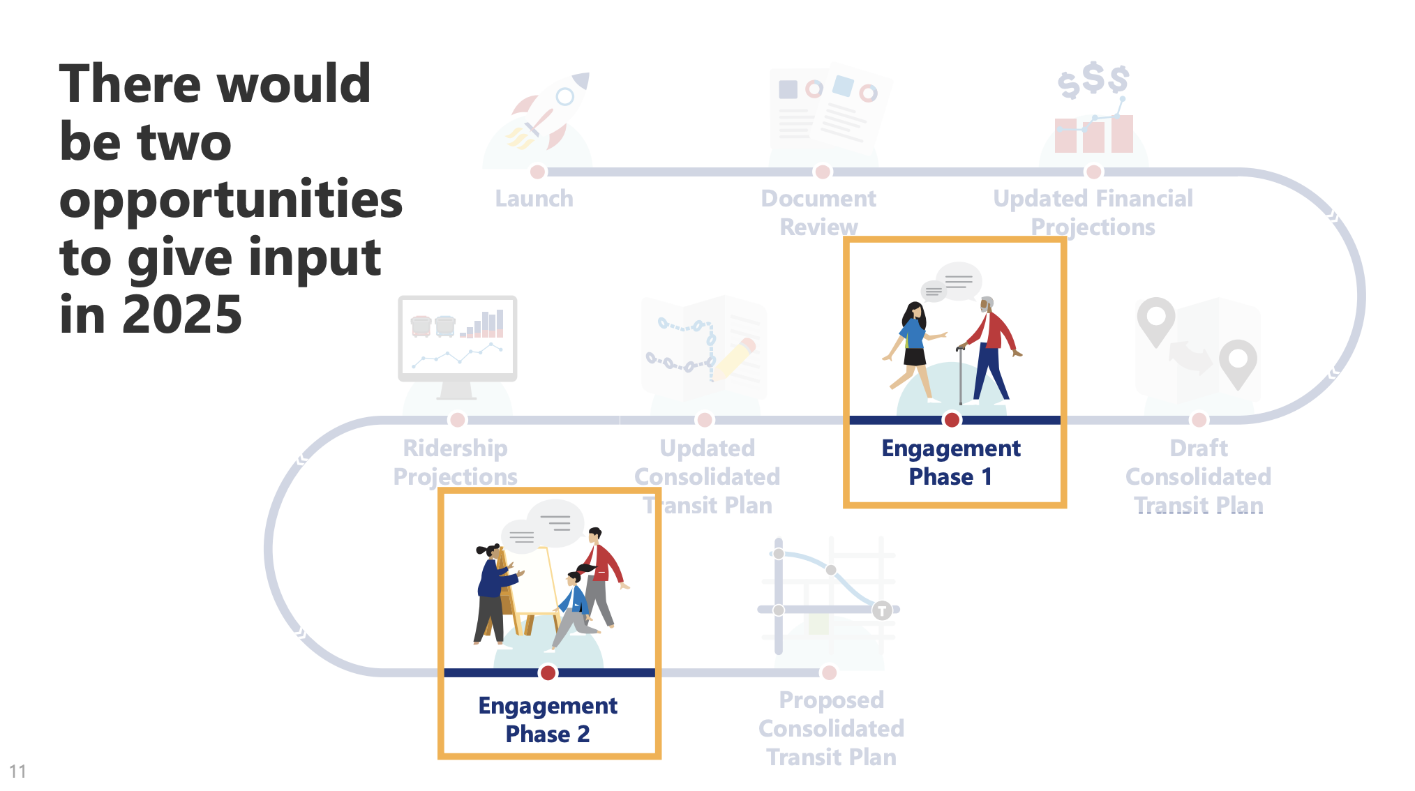 The new timeline would involve targeted stakeholder outreach during the first half of this year and then larger public engagement in 2025 with two key touchpoints between draft transit consolidation plans. Councilmember Paula Rhyne asked Behee why it seemed the project was mostly going on pause during the summer.