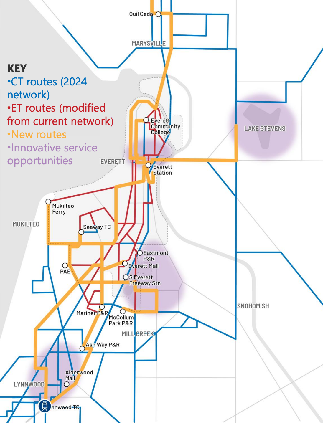 “There are some new routes that would be operated within the city that service some of the remaining gaps,” Behee said. “There’s not a lot of them, but there are some key areas, particularly when you look at some areas like South Everett that aren’t as completely covered as they might be.” Improved coverage could also come to North Everett.