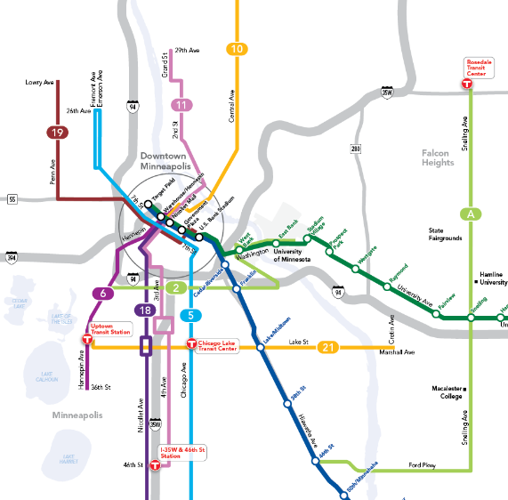 Looking beyond light rail, bus service is spotty, which is reflected in ridership data. Metro Transit has implemented one bus rapid transit (BRT) line (the “A line” on Snelling Avenue in Saint Paul) and is planning more, although they’ve tilted toward suburban commuter service rather than a reliable urban grid. The flagship of the Twin Cities bus network is far and away the Route 5, which runs from Mall of America to Brooklyn Center–with average weekday ridership of 19,000. That beats Seattle’s RapidRide E which averaged 17,000 weekday rides at last count (the E is a 13-mile route while the 5 is about 20 miles.) Meanwhile, Minnesota’s new A line BRT clocked in just above 4,700 last year.