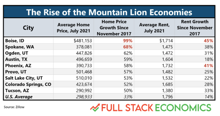 Recently, Boise was placed at the top of a list “mountain lion” cities, by Fullstack Economics, which theorizes that growth in these cities has been fueled by a spillover effect from coastal cities, like San Francisco and Los Angeles. According to Fullstack, the appeal of these cities is rooted in their distinctive natural settings, access to universities, burgeoning tech sectors, and (relatively) affordable housing prices.