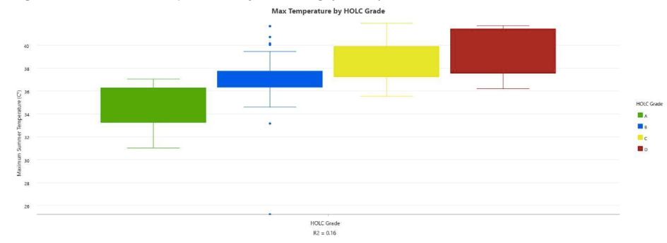 The box-plot below shows the positive correlation between Seattle’s historic redlining grade (HOLC grade) and maximum summertime temperature. Areas that were historically redlined are more likely to experience higher temperatures today.