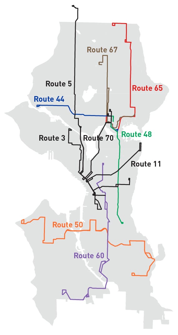 - Adding service generally for span and frequency. A mix of Seattle and suburban routes will get added service to improve span and frequency, including on weekends. These trips will go to Routes 3, 4, 5, 8, 11, 14, 17, 40, 41, 44, 48, 50, 60, 65, 67, 70, 120, 131, 169, 269, 301, 316, and RapidRide C, D, and E Lines.