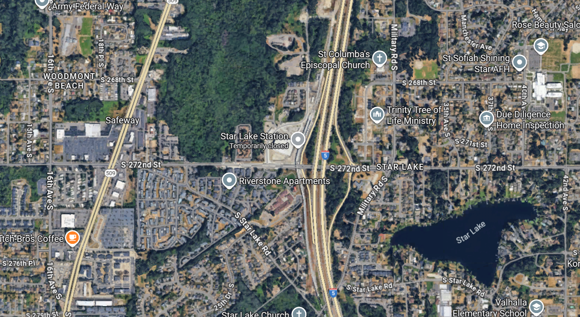 Star Lake Station is located between I-5, its own parking garage, and the McSorley Creek Wetlands. There are no new or active multifamily or mixed active projects in its station area. The station area has some older multifamily buildings, an elementary school, an ongoing single family subdivision project, and houses of worship. Without a robust real estate market, everything surrounding the station will be prohibitive to new dense development.