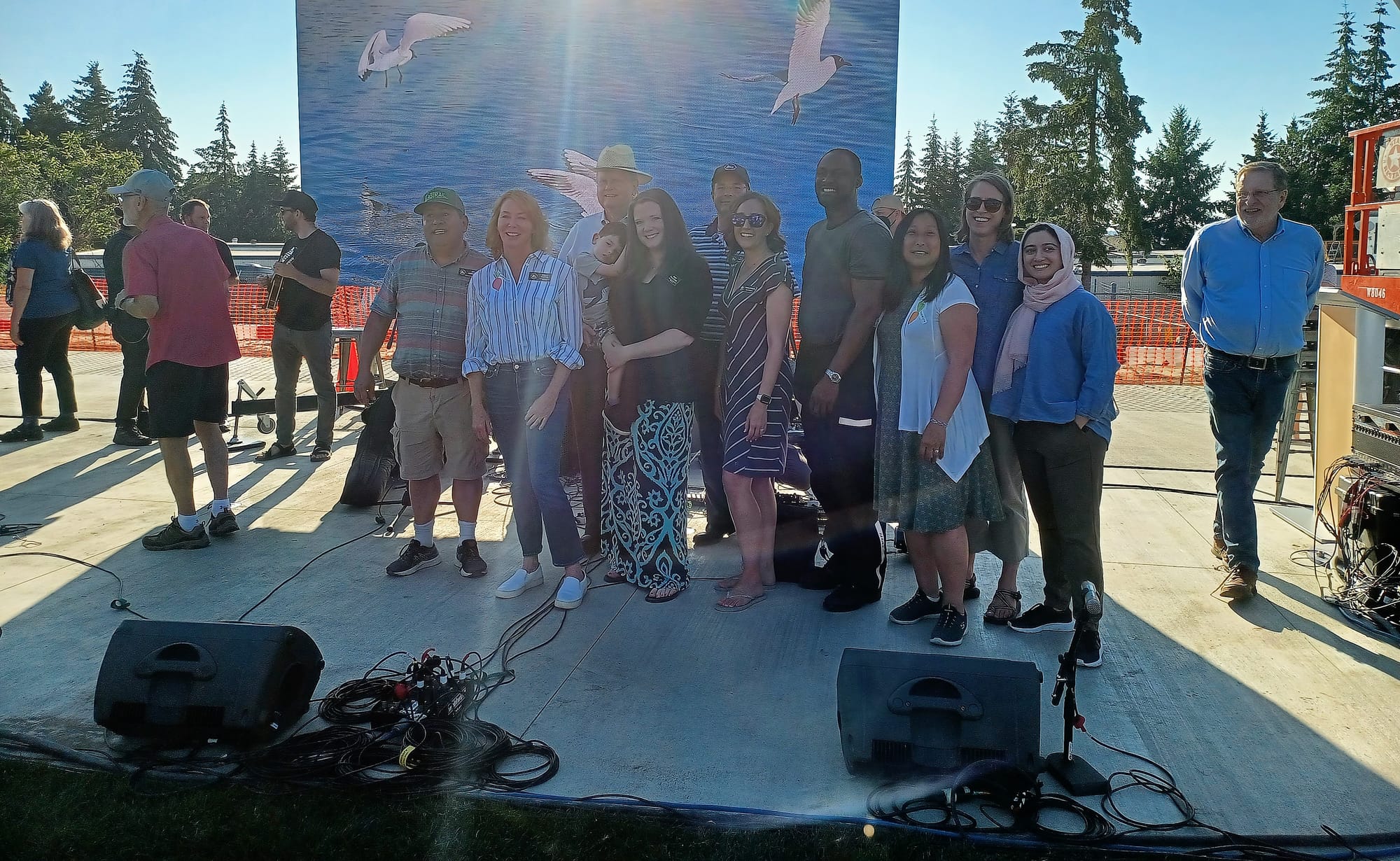 Paco Galanes, Google’s Site Lead, shared, “We are very proud of our partnership with the city to bring this new park here for all the people in Kirkland. We call Kirkland our home, and we hope to keep growing here.” Earlier this year, Google opened two new buildings at the nearby Kirkland Urban site, with two more to come in the next few years. Dave Thompson of SRM Development, the company behind the Feriton Spur project, pointed out the uniqueness of the trail-oriented park and introduced Amber Mikluscak, the artist contracted to complete a sculpture for the amphitheater. Parts were taken from the Kalakala, a ferry that operated on Puget Sound in the mid-20th century, and restored to create a colorful piece that’s over fifteen feet tall.