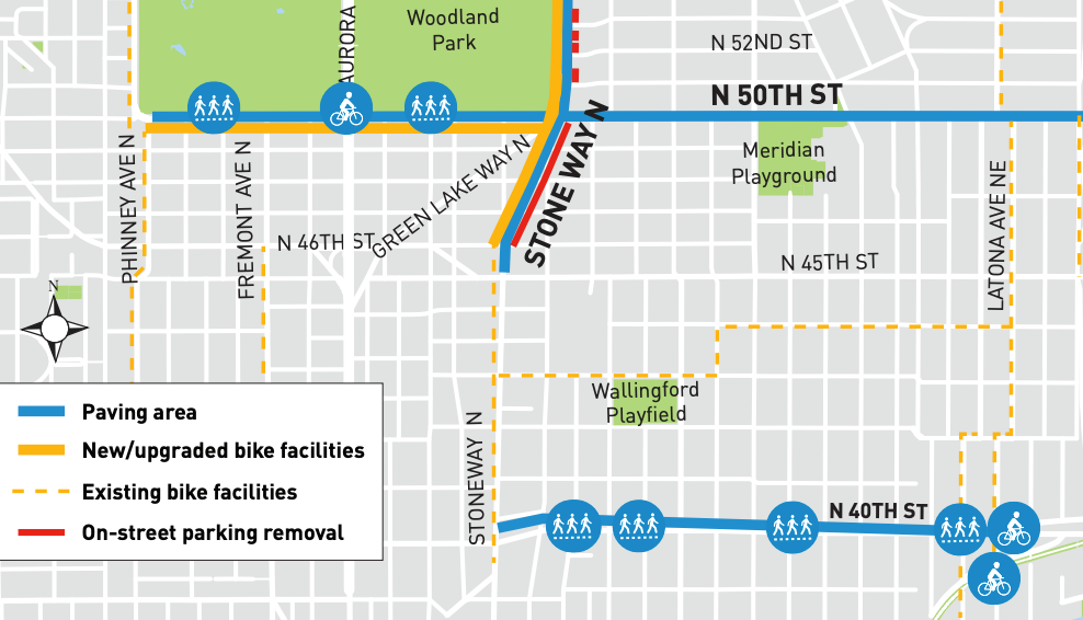 The Seattle Department of Transportation (SDOT) has announced that work has been paused on the final segment of arterial street repaving in its Green Lake and Wallingford street repaving package. Stone Way N between N 45th St and N 50th St will not be repaved this year and as a result will not see protected bike lanes installed on that segment either. SDOT cites a “change of funding availability due to the Covid-19 pandemic and other competing needs” as the reason for the indefinite pause.