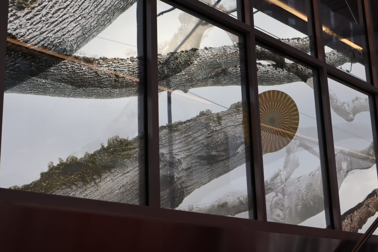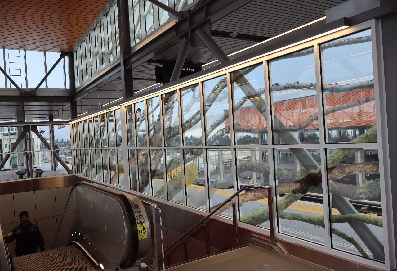 The most striking feature at Kent Des Moines Station is the artwork on the glass at the platform level: a piece called “Cambium.” It was created by Houston-based RE:site Studio. The tree branches etched into the glass climb toward the center of the station, mimicking the arc of the escalators that bring riders up from street level.
